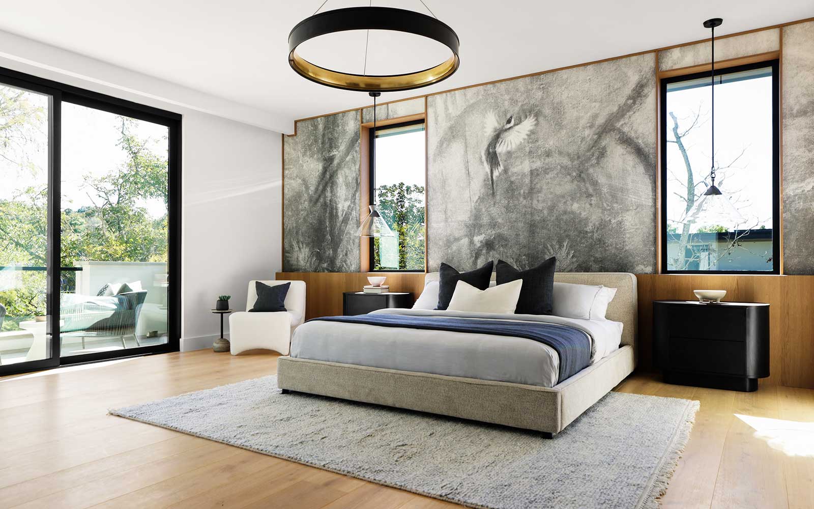 The property offers three bedrooms and four bathrooms, with features like a glass elevator connecting the floors, a wine bar and a climate-controlled wine cooler. The two-car garage is equipped with EV chargers, while a plunge pool and hydraulic boat lift cater to lakeside living. It is also wired with a smart system for remote control of temperature, lighting and security.